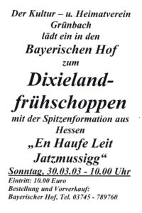 Nach einer Unterbrechung in den 1990er Jahren konnte der Verein 1998 auch die beliebten Dixielandfrühschoppen wieder aufleben lassen. Mit dem renovierten Willi-Rudert-Saal im Bayerischen Hof stand auch eine geeignete Lokalität zur Verfügung, denn die Turnhalle wurde als zu groß angesehen, das war eine richtige Entscheidung, wenn man die Besucherzahlen der ersten Jahre nach Wiederbeginn betrachtet.